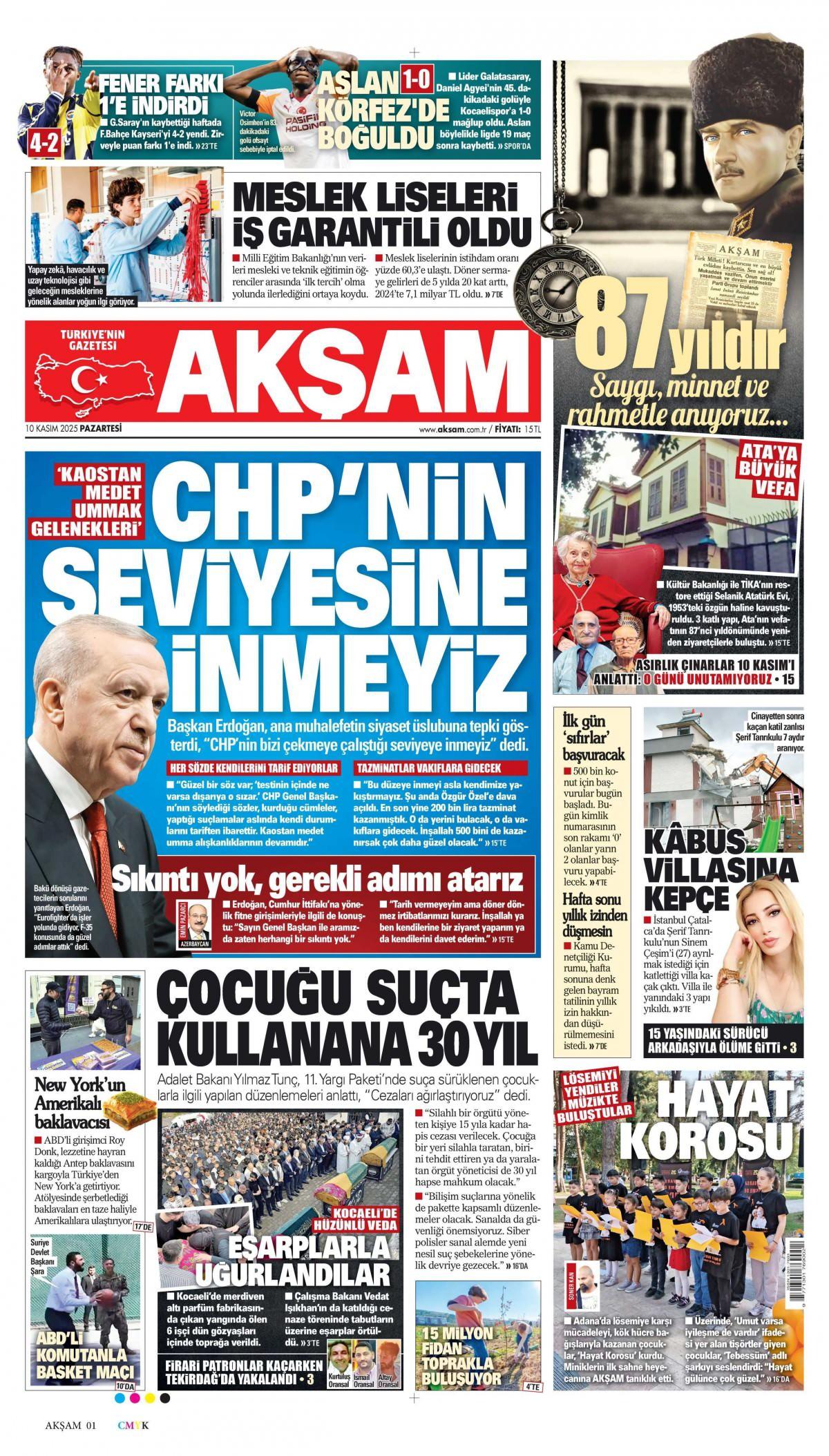 Akşam Gazetesi 10 Kasım 2025 Günü Manşeti