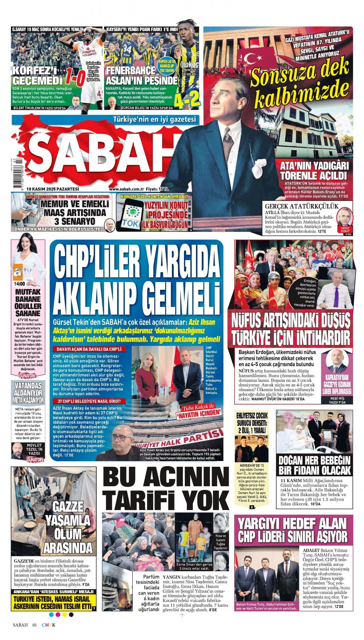 Sabah Gazetesi 10 Kasım 2025 Günü Manşeti